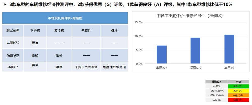 新能源汽车专项:该专项测评包含车辆维修经济性和车辆安全性两部分。在首批纳入测评的3款车型中,测评结果均为优秀。尤其在底部碰撞防护方面,展现了行业在三电核心安全上的扎实基础。测评也发现,在面向中轻度托底工况的耐撞性和维修经济性、车辆安全性设计评估方面等方面,行业仍存在共同的优化空间,为后续技术发展指明了方向。
