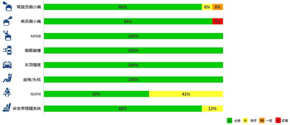 车内乘员安全:该维度整体表现优异,94%的车型获得优秀及以上评价。测试车型的安全配置愈加丰富,近一半的测试车型配置前排中间气囊、后排侧气囊;在车辆结构和约束系统性能表现方面,测试车型整体呈现出较高水平(在重点考核结构强度的小偏置、侧碰和车顶强度测试工况中,以及考核乘员伤害的主要测试工况中,获得优秀评价的比例均在90%左右)。